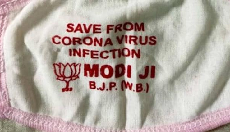 कोरोना वायरस (Coronavirus) को लेकर अब भारत में राजनीति भी जोर पकड़ती जा रही है। कोलकाता में भारतीय जनता पार्टी की राज्य इकाई के स्थानीय नेताओं ने लोगों में ऐसे मास्क बांटे हैं जिन पर लिखा हुआ है, 'कोरोना वायरस के इंफेक्शन से बचाइए प्रधानमंत्री नरेंद्र मोदी जी'। ऐसे मास्क कई लोगों में बांटे गए हैं।