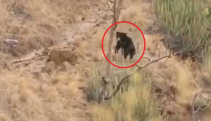बाघ की लड़ाई के वीडियो अक्सर लोगों द्वारा पसंद किए जाते है। हाल ही में सोशल मीडिया पर एक वीडियो वायरल हो रहा है जिसमें एक बाघ और सुस्त भालू के बीच झड़प दिख रही है। ये वीडियो राजस्थान (Rajasthan) के रणथंभौर नेशनल पार्क (Ranthambore National Park) का है। एक मिनट 21 सेकंड की क्लिप में देखा जा सकता है कि बाघ सबसे पहले सुस्त भालू पर हावी होने की कोशिश करता है। । कुछ देर बाद परेशान होकर भालू खड़ा हो जाता है, जिसको देखकर बाघ डरकर भाग निकलता है और भालू उसका पीछा करने लगता है।
