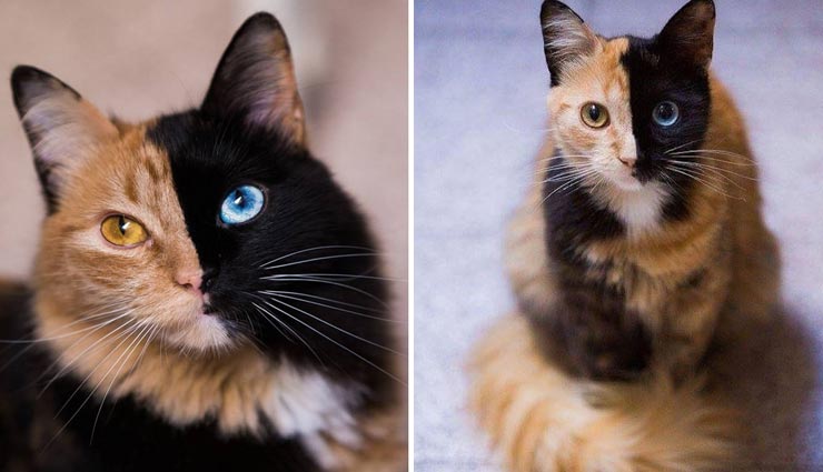 हैरानी की बात यह है कि इसके दो चेहरे हैं। आप खुद इसकी फोटो देखकर यह बात समझ गए होंगे कि इसके दो चेहरे हैं और दोनों ही खूबसूरत है। जी दरअसल यह बिल्ली अर्जेंटीना में रहती है और केवल इसका रंग ही बल्कि इस बिल्ली की आंखों का रंग भी अलग-अलग है। इसकी एक आंख भूरी है और दूसरी नीली है। जी दरअसल इसे Chimerism कहा जाता है। वहीं इसमें जानवरों का रंग ज्यादा ही बदल जाता है। वैसे इस बिल्ली में कई रंग है और वो चेहरे के साथ-साथ शरीर के कई हिस्सों में अलग-अलग रंग की है।